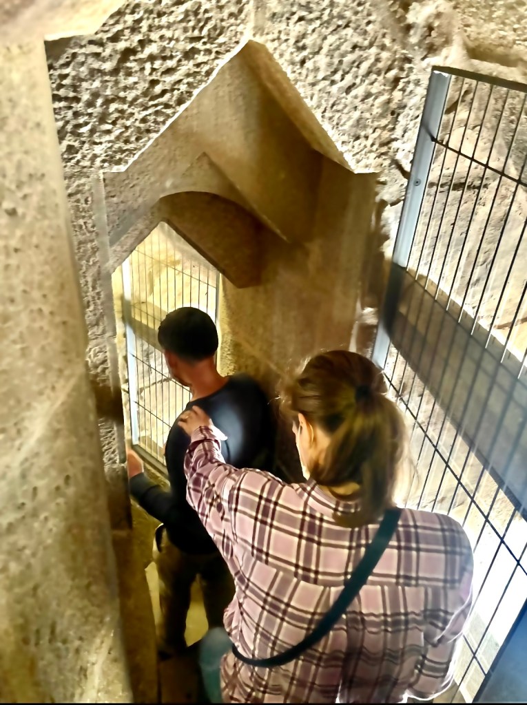 Aside from admiring one of the largest tourist attractions in Spain, I had to face a fear. Once inside, I knew my fear was lurking around the corner, literally. The tickets were purchased in advance, this was happening. Our party of four entered the tower elevator. All of us knowing this elevator was special, it only went UP! You had to find your way DOWN. Now seems like a good time to mention the towers of this church are over 30 stories high? YES, I said OVER 30 stories high! And the number of stairs you have to take down; 504!